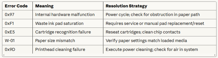 Epson’s error notification system employs alphanumeric codes that, whilst initially cryptic, provide precise diagnostic information once decoded. Understanding common error families accelerates troubleshooting.