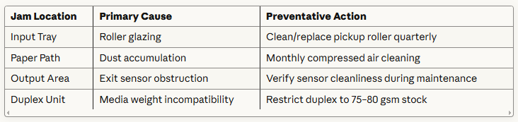 - Input tray jams suggest pickup roller degradation or incorrect paper guides